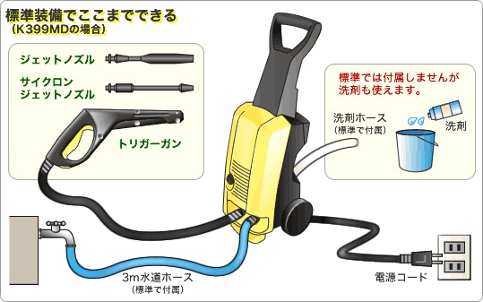 漢字だけ見ると何やらスゴそうな業務用機械を連想しがちだが、実際はコンパクトな家庭用クリーナー。水道ホースに直結して使い、ノズルの先から出る高圧の水でクルマや家の外回りをクリーニングするものだ。