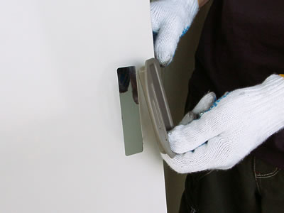 扉パネルの一番上は、戸車を外側から内側に向かって取り付け、前ランマ内側の溝に組み込んで滑らせます。前ランマの溝に沿って戸車が滑らかに走り、「スーッ、スーッ」と軽快な感触が楽しめます!