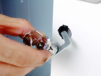 扉パネルに開いた小さな穴。それは錠前を取り付けるための穴です。小さいけど手応えのある重さの錠前(もちろん同梱されています)を、前から差し入れましょう。グッと強く押し込めば固定されます。