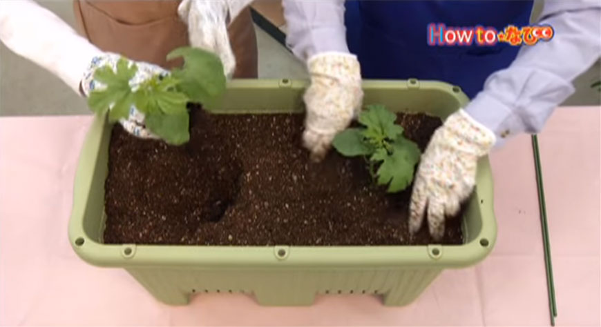 少し深めに掘り、ポットの土と同じくらいの高さに植え付けます。苗同士が近くなりすぎないよう、45~50cm空けて2本植えます。