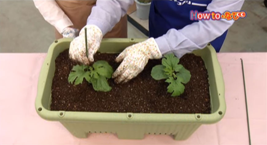 最初はネットに届きにくいので、苗の脇に支柱を立てます。この時、根をいためないようにしましょう。こうすることで、ツルが支柱にからまり、大きく伸びます。ビニールタイで輪を作り、緩めに苗と支柱とを結んであげれば倒れる事もなく安心です。